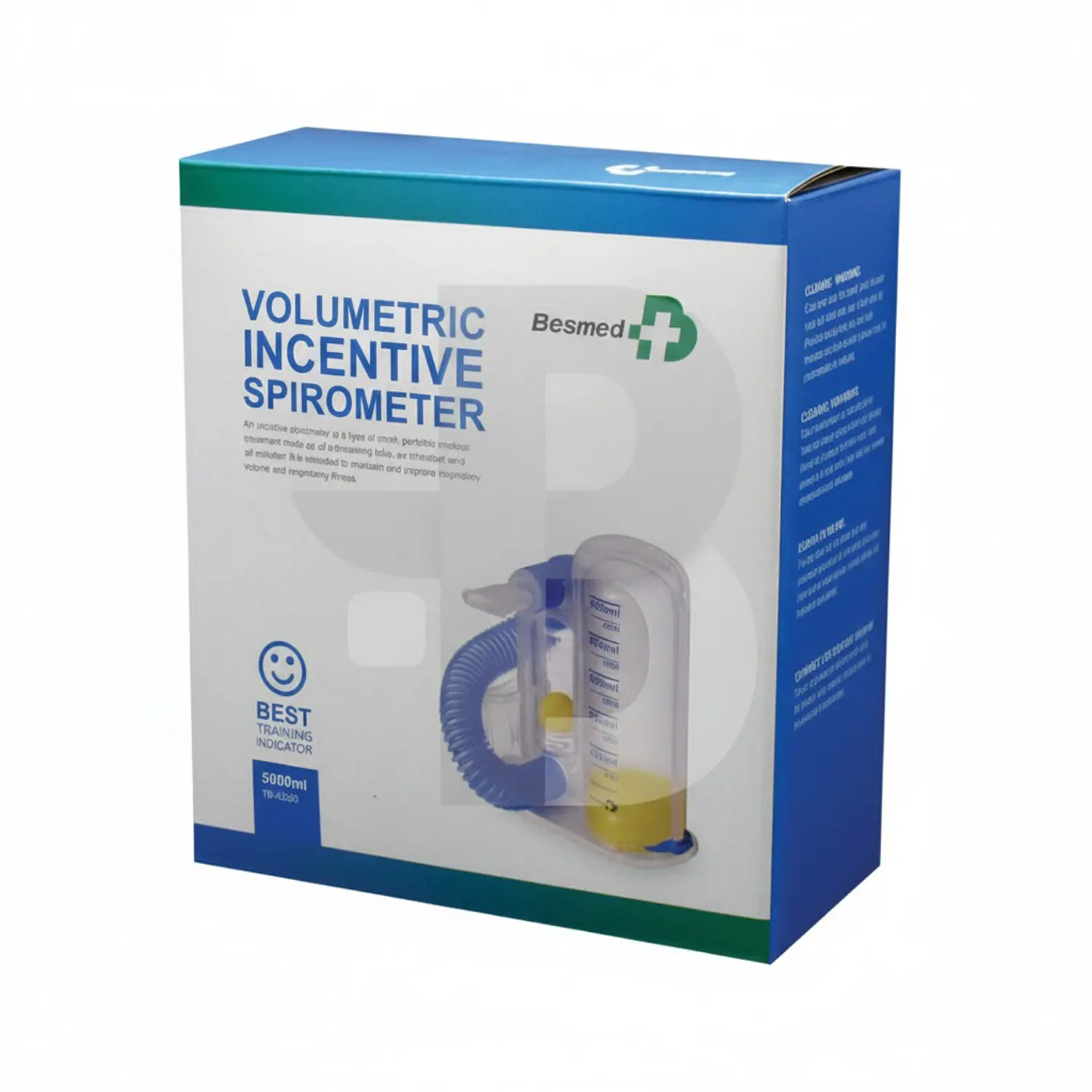 اسپیرومتری تشویقی 5000 تک پیستون بسمد Besmed مدل TB-93500 یک دستگاه کوچک، سبک و قابل حمل است که با استفاده از سیستم تک پیستون مدرج، میزان دم و حجم هوای ورودی به ریهها را اندازهگیری میکند. این دستگاه از طریق یک لوله خرطومی به قطعه دهانی متصل میشود و با تنفس صحیح، پیستون دستگاه بالا رفته و میزان ظرفیت تنفسی را نمایش میدهد.
